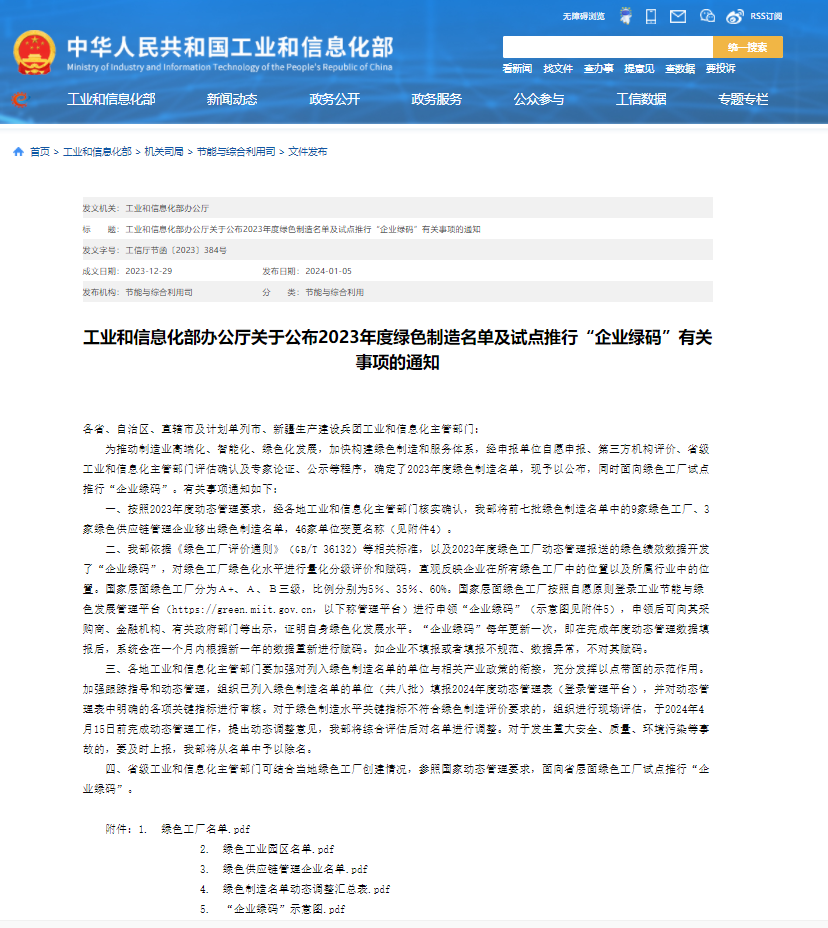 2024年1月5日,工信部发布《关于公布2023年度绿色制造名单的通知》,新疆一号娱乐科技股份有限公司喜获“绿色供应链管理企业”称号。